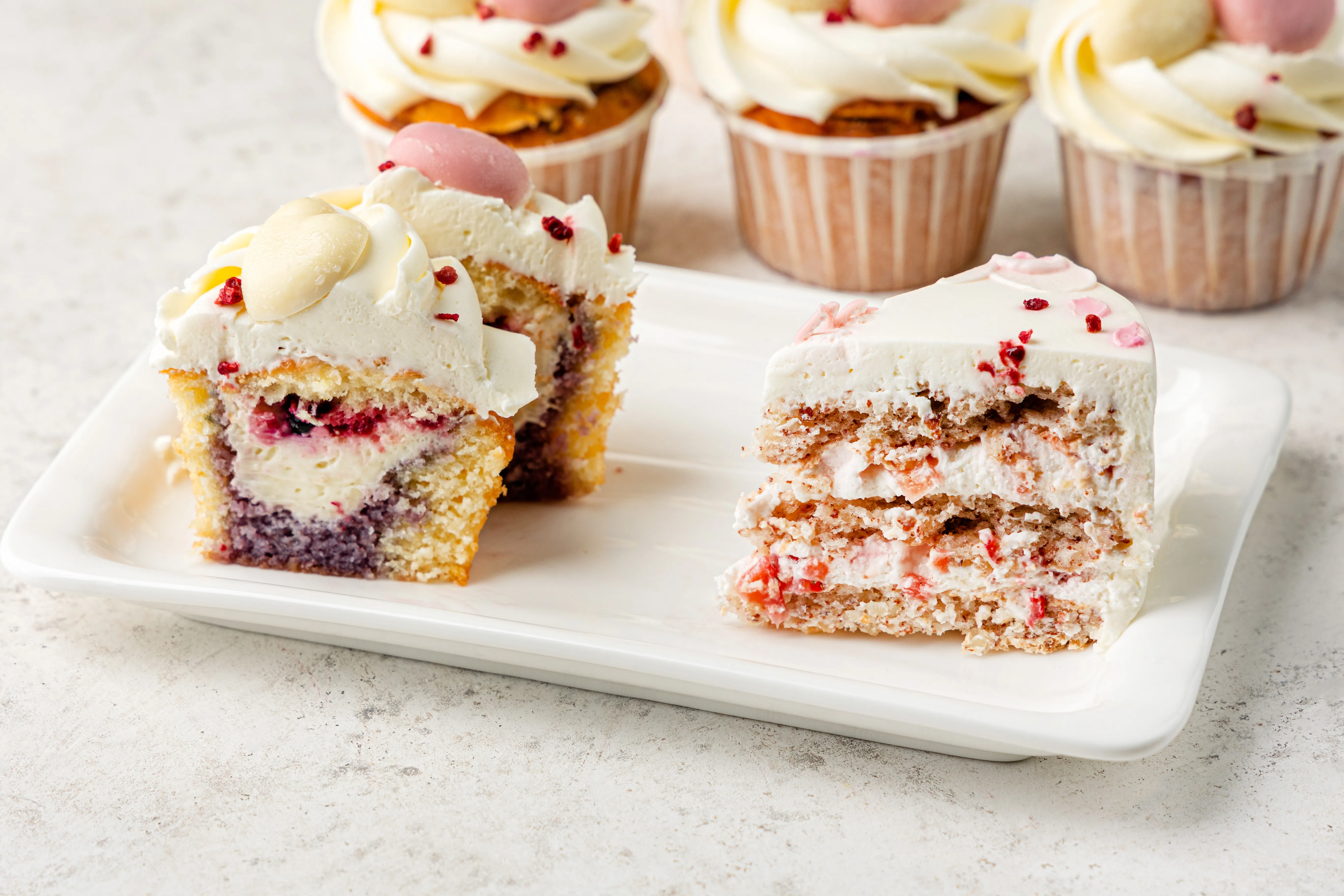 Капкейки с начинкой "Лесная ягода" Бисквит:(белок яичный,желток яичный, сахар, мука в/с, натуральный ароматизатор -ваниль)), крем (молоко м.д.ж.3,2%, желток яичный, натруальный ароматизатор -ваниль), сахар, кукурузный крахмал, масло сливочное м.д.ж. 82,5% (пастеризованные сливки из коровьего молока)), черника замороженная, малина замороженная, клубника замороженная, черничный сироп (черника замороженная, вода).Крем:сливки натуральные м.д.ж. 33% (сливки нормализованные),творожный сыр (нормализованное пастеризованное коровье молоко, бактериальная закваска, молокосвертывающий фермент микробного происхождения), загуститель модифицированный крахмал, стабилизатор (камедь рожкового дерева и гуаровая камедь), регулятор кислотности лимонная кислота, соль поваренная пищевая, вода питьевая).