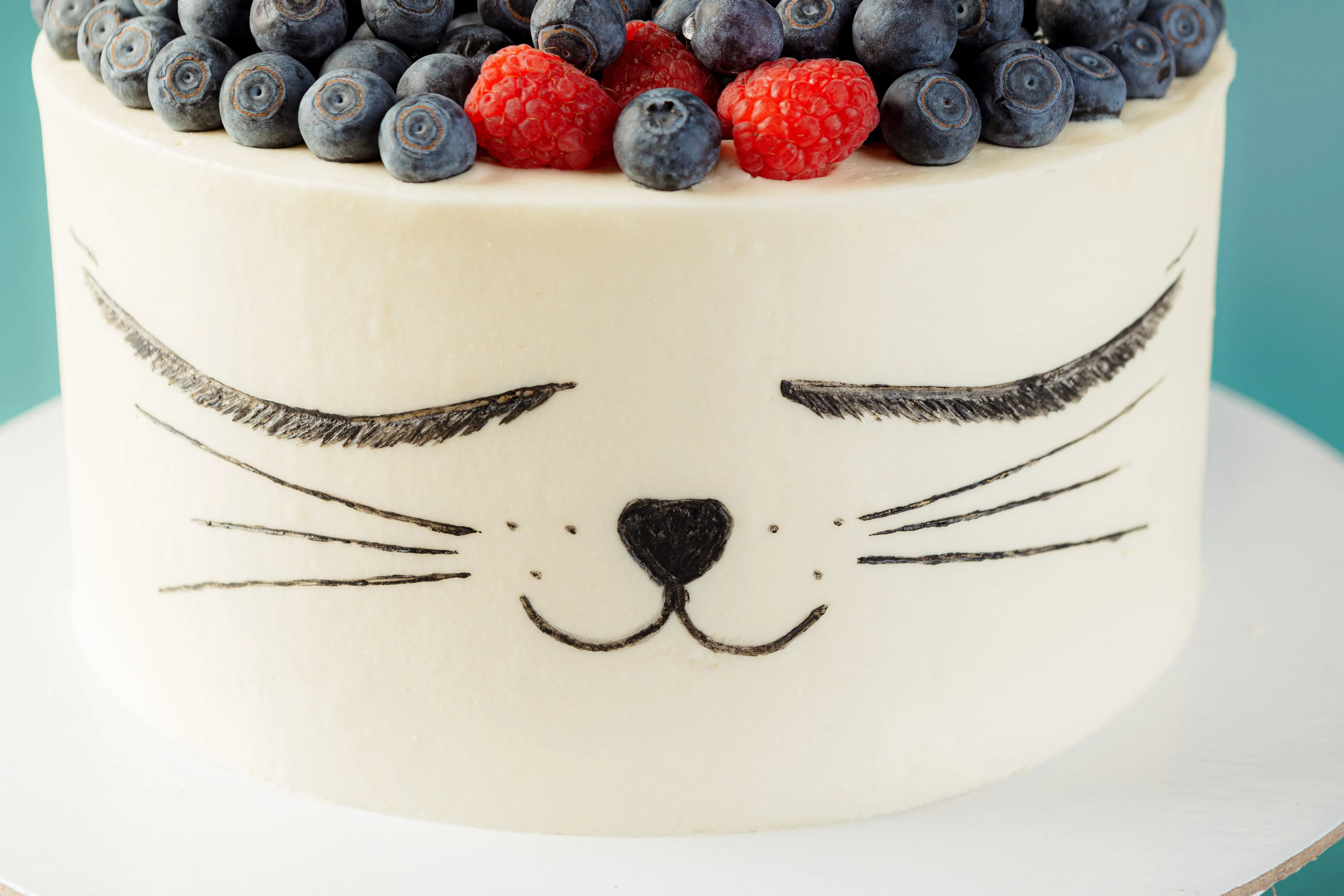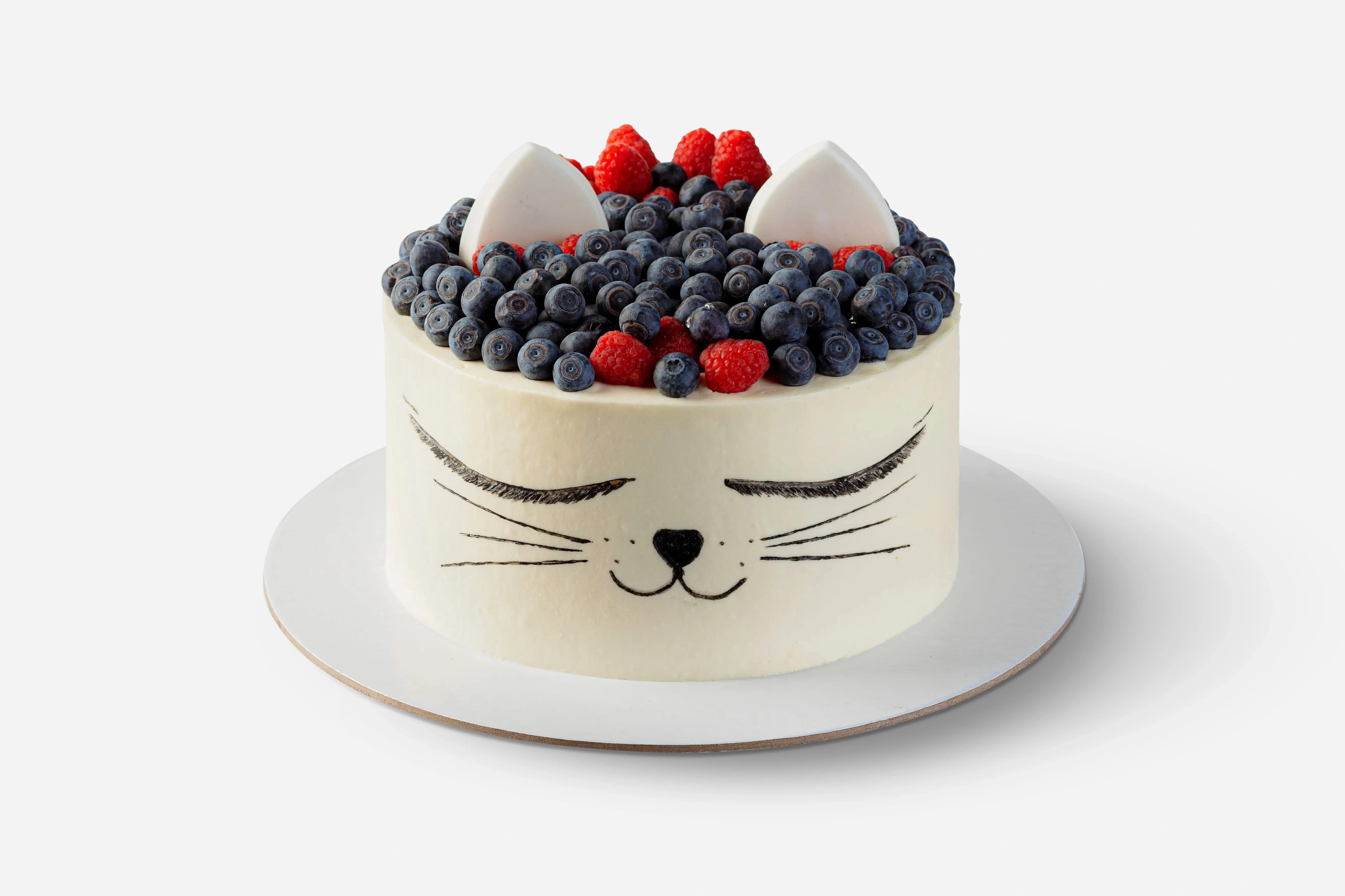 Покрытие: сливки натуральные м.д.ж. 33% (сливки нормализованные), сыр творожный (творог (нормализованное пастеризованное молоко, закваска, молокосвертывающий фермент микробного происхождения), сахар, угольный краситель. Ягоды: малина свежая, голубика свежая Декор (ушки котика): сахарная пудра, вода, желатин, патока.