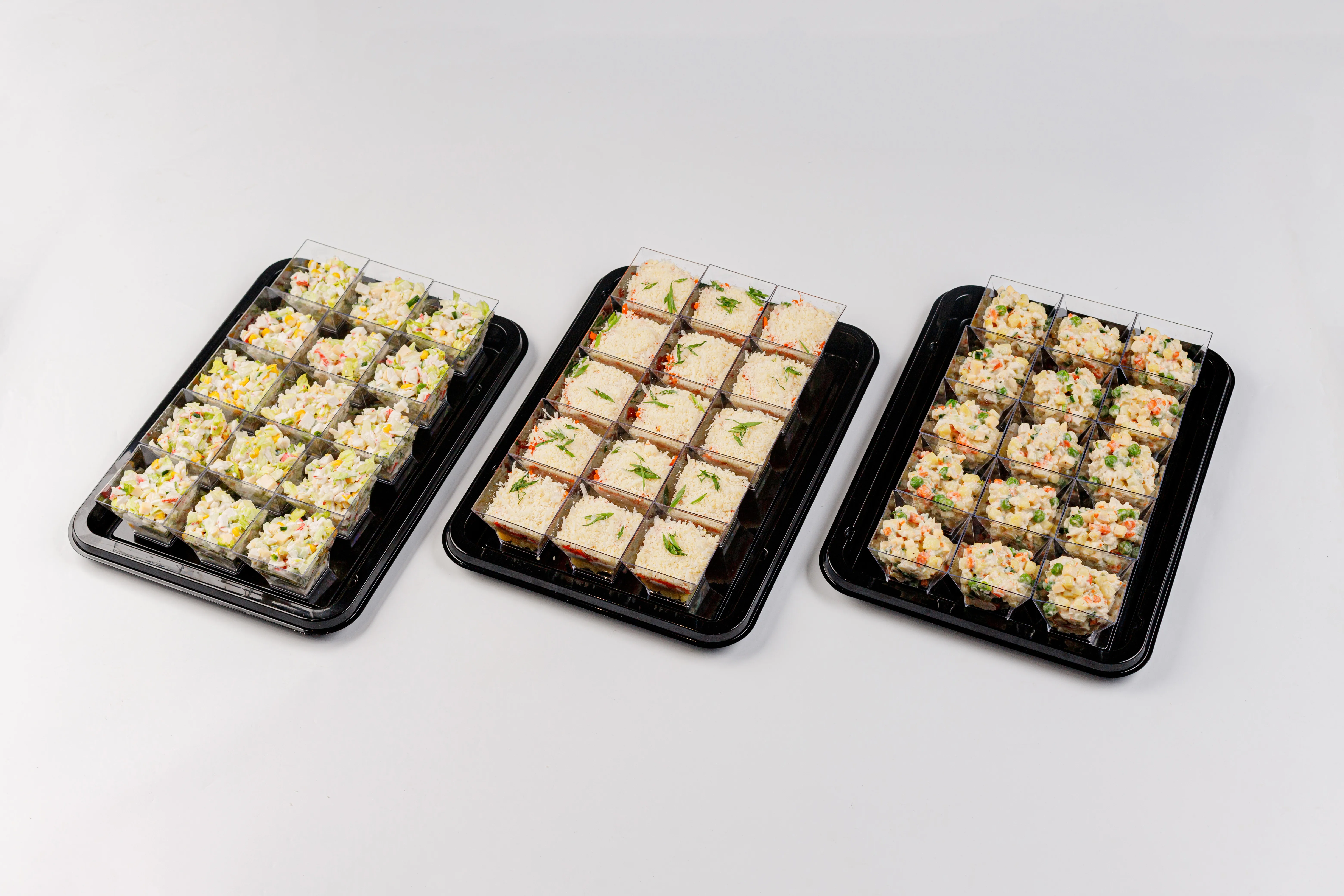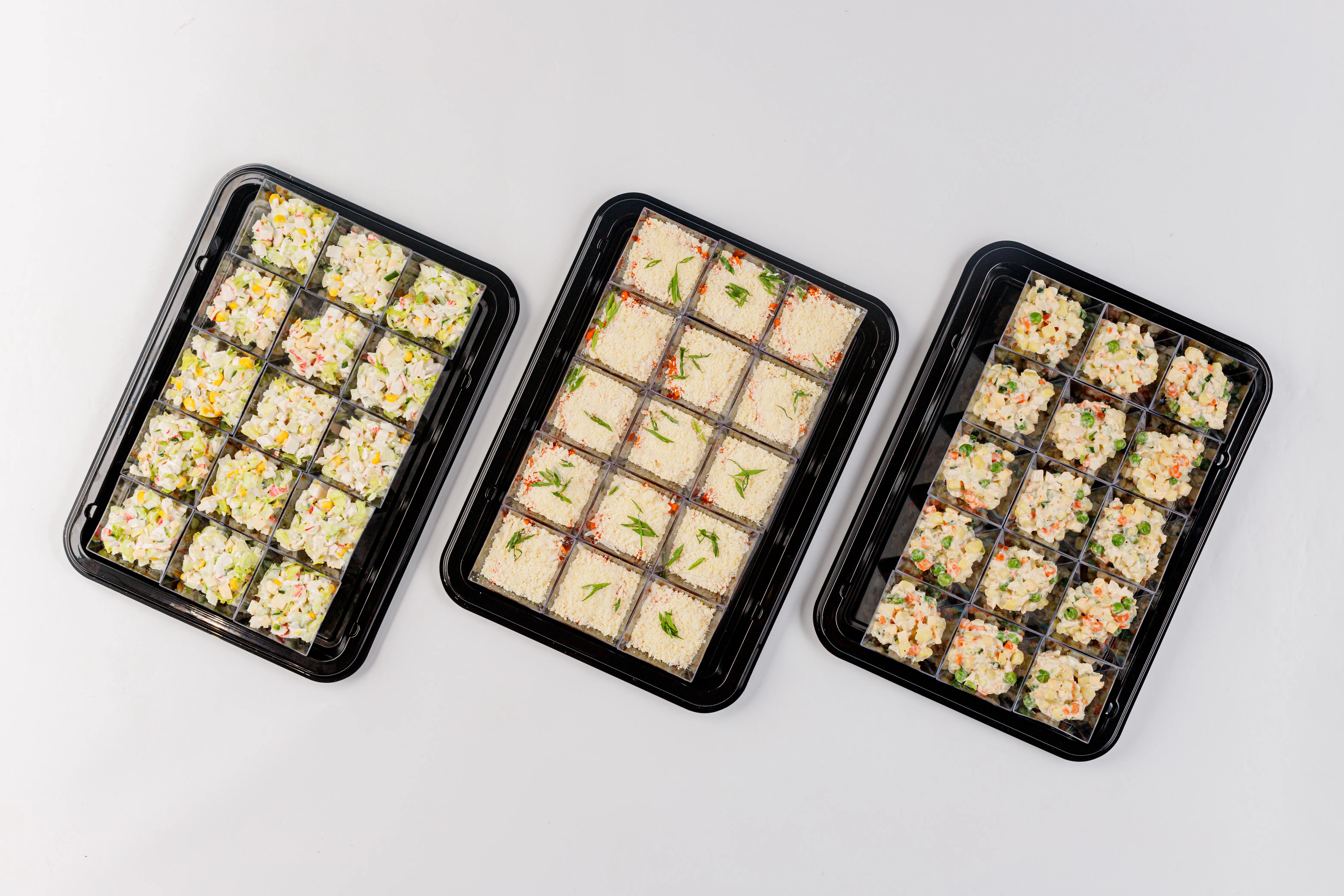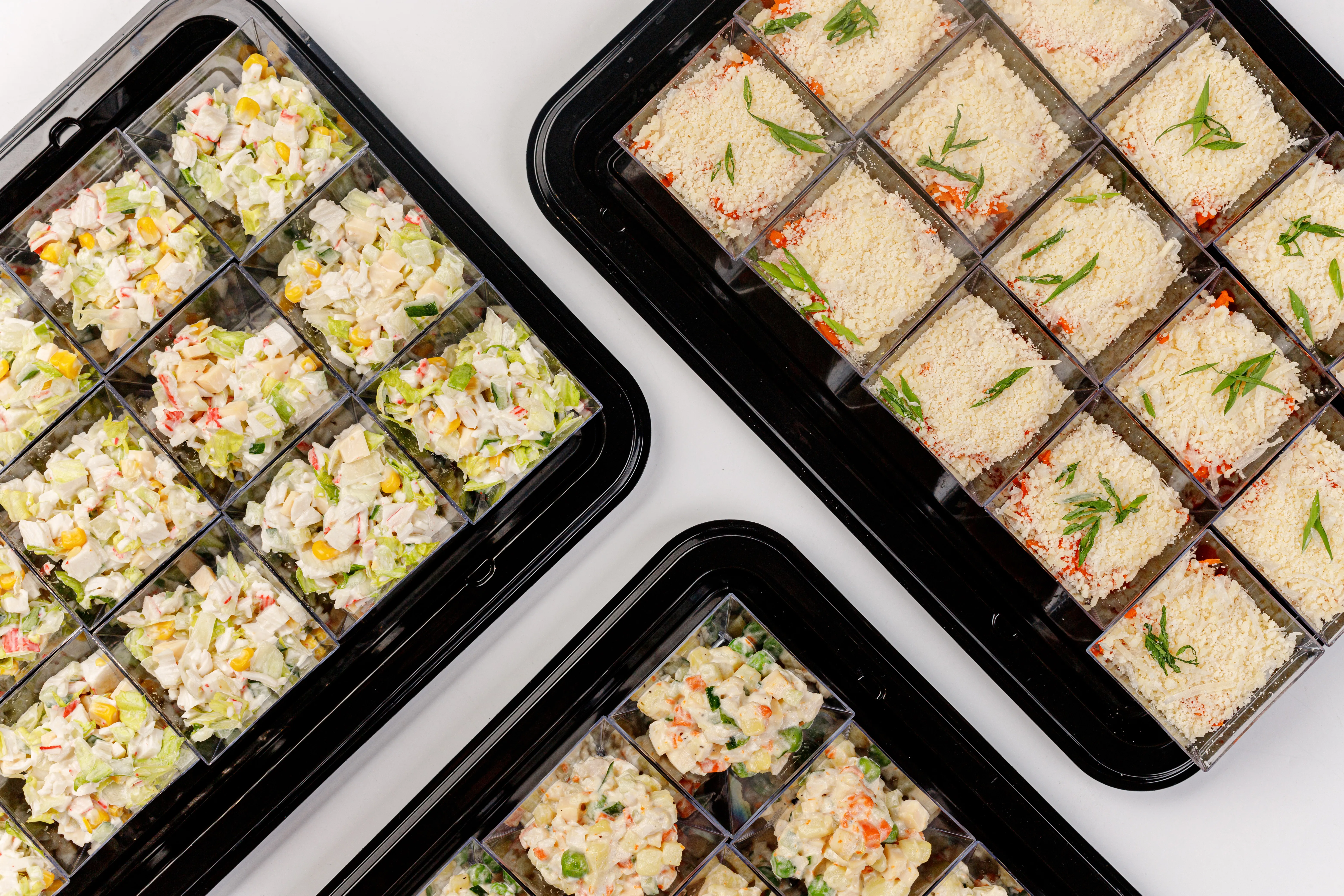 Сет популярных салатов: Оливье с филе индейки, Крабовый и Мимоза – идеальный выбор для большой компании. Классические вкусы, проверенные временем, в удобной подаче – отличное решение для фуршетов, банкетов, корпоративных мероприятий и домашних праздников.