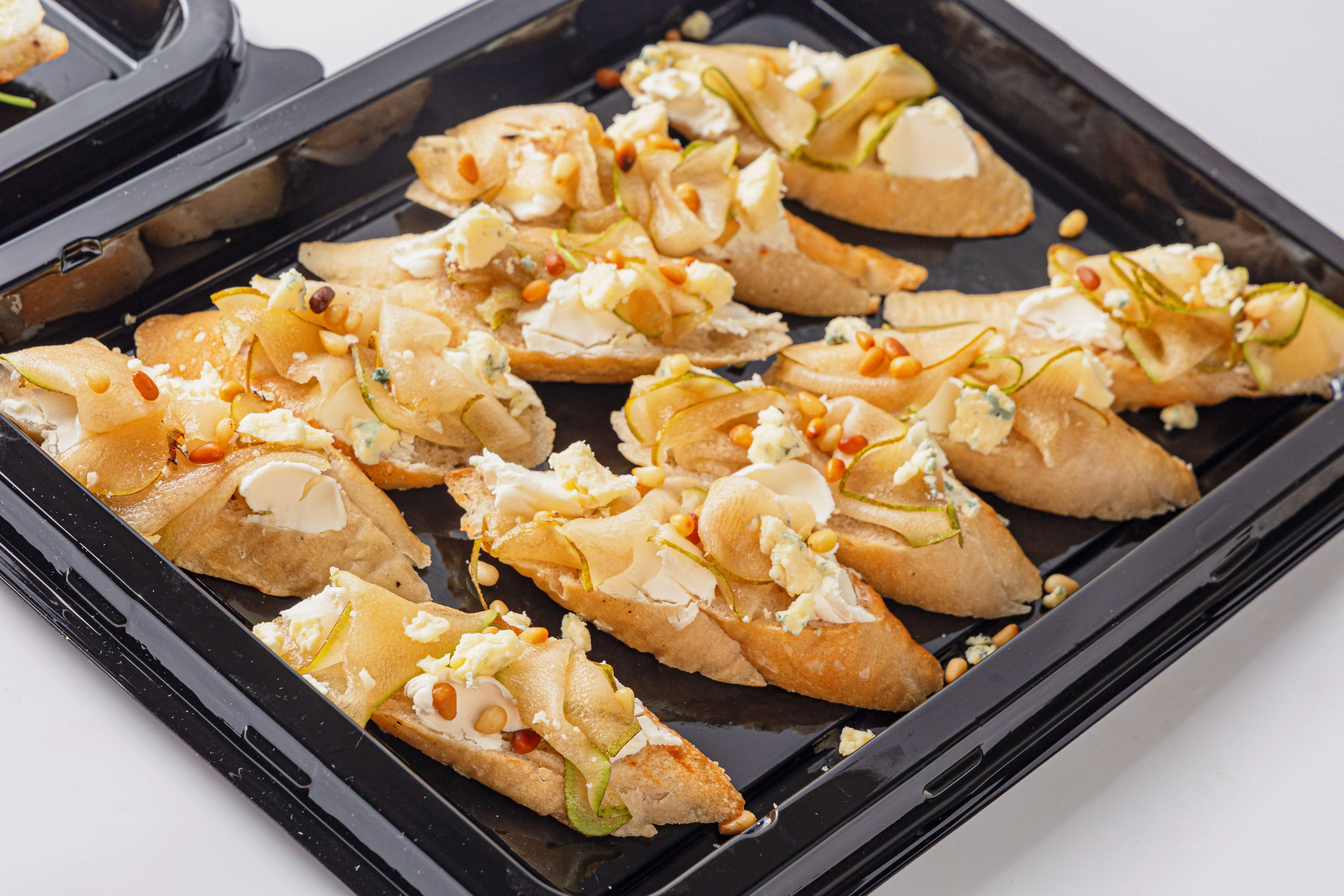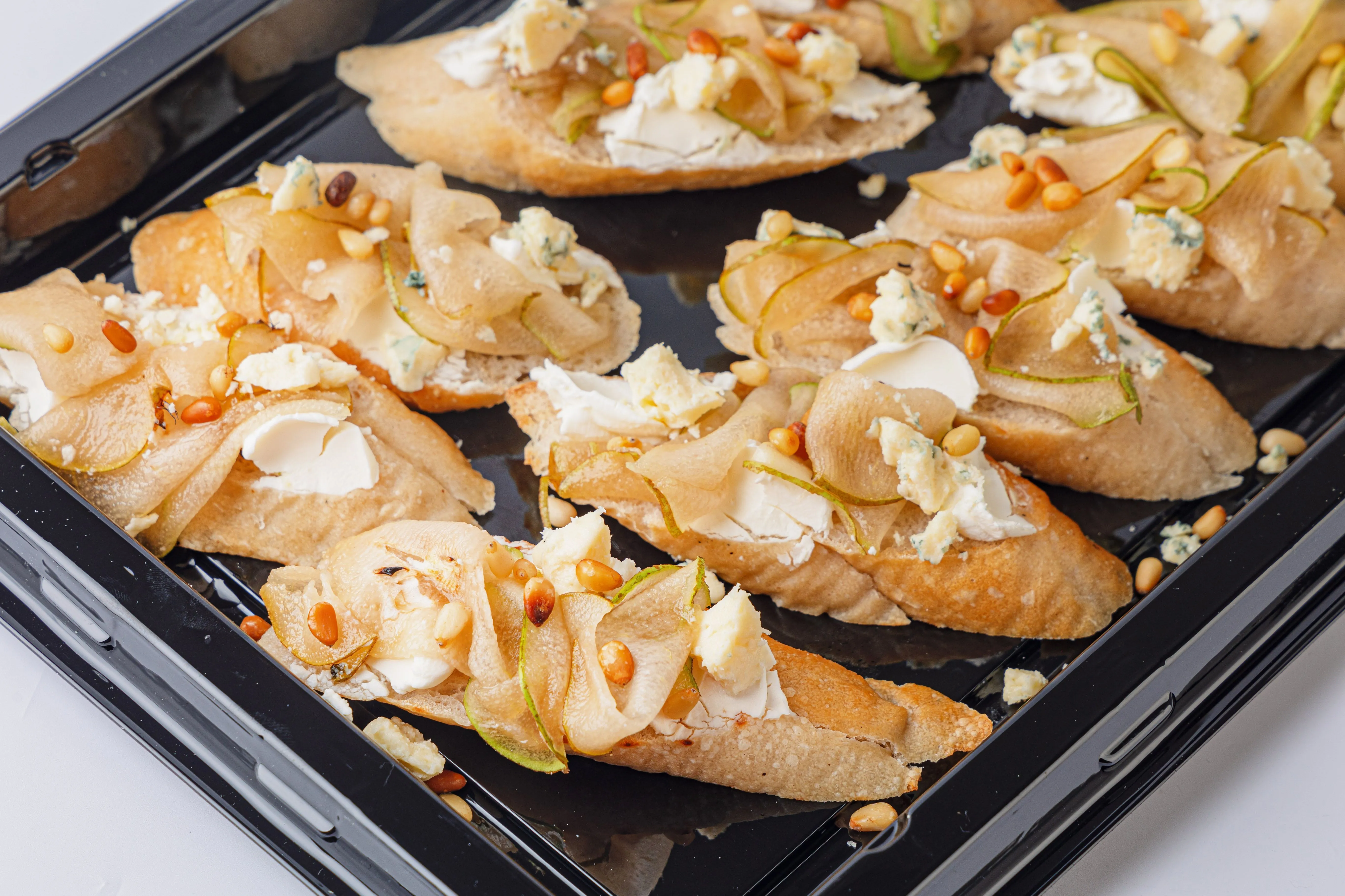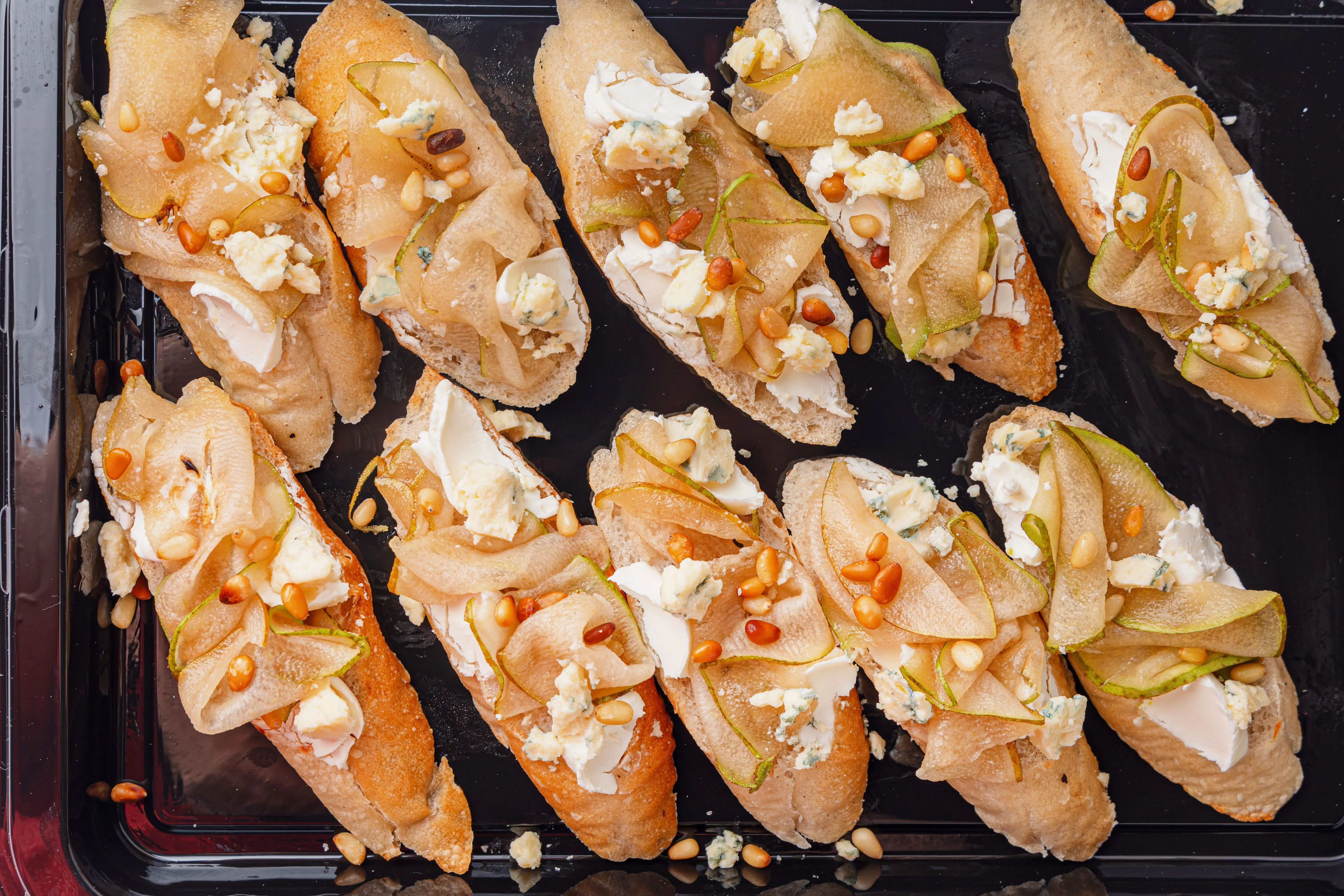 Брускетты с карамелизированной грушей, сыром горгонзола и кедровыми орешками – это изысканное сочетание сладости и пикантности. Хрустящая основа, покрытая нежной грушей, обжаренной до золотистого цвета, сливочным сыром горгонзола и хрустящими кедровыми орешками, создаёт гармоничный вкус. Идеальны для праздничного стола или особого случая. Купить брускетты можно вместе с другими вкусами для разнообразия или в дополнении к сытным блюдам.