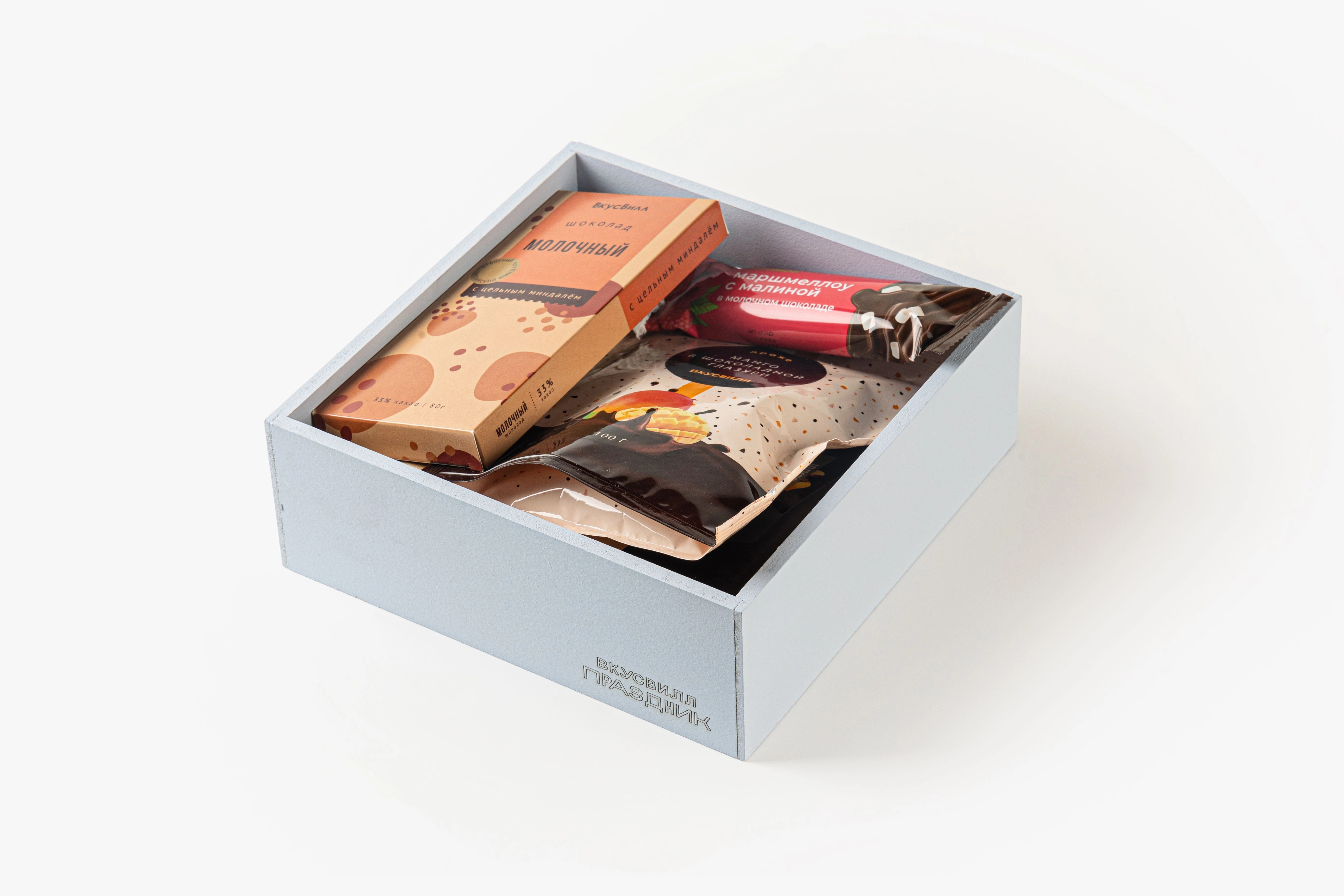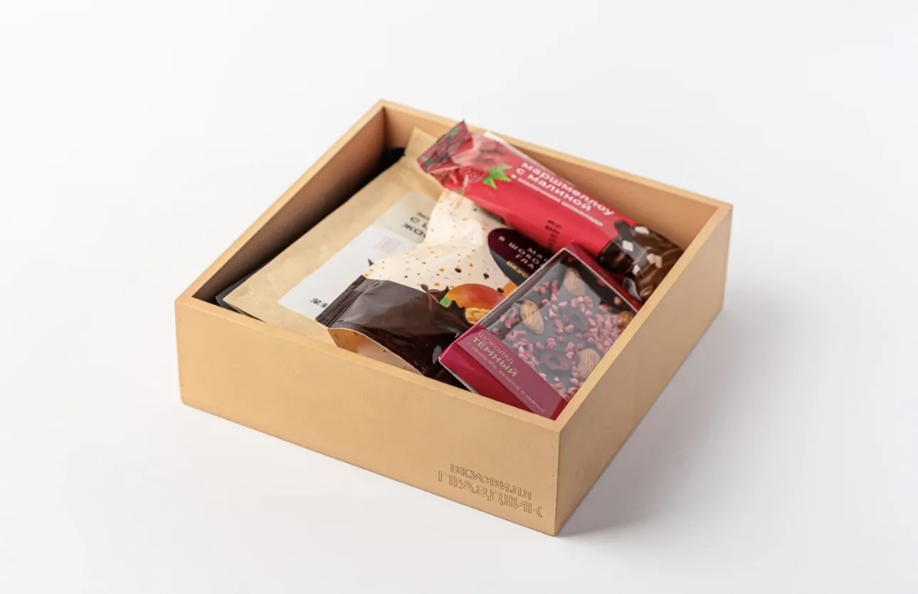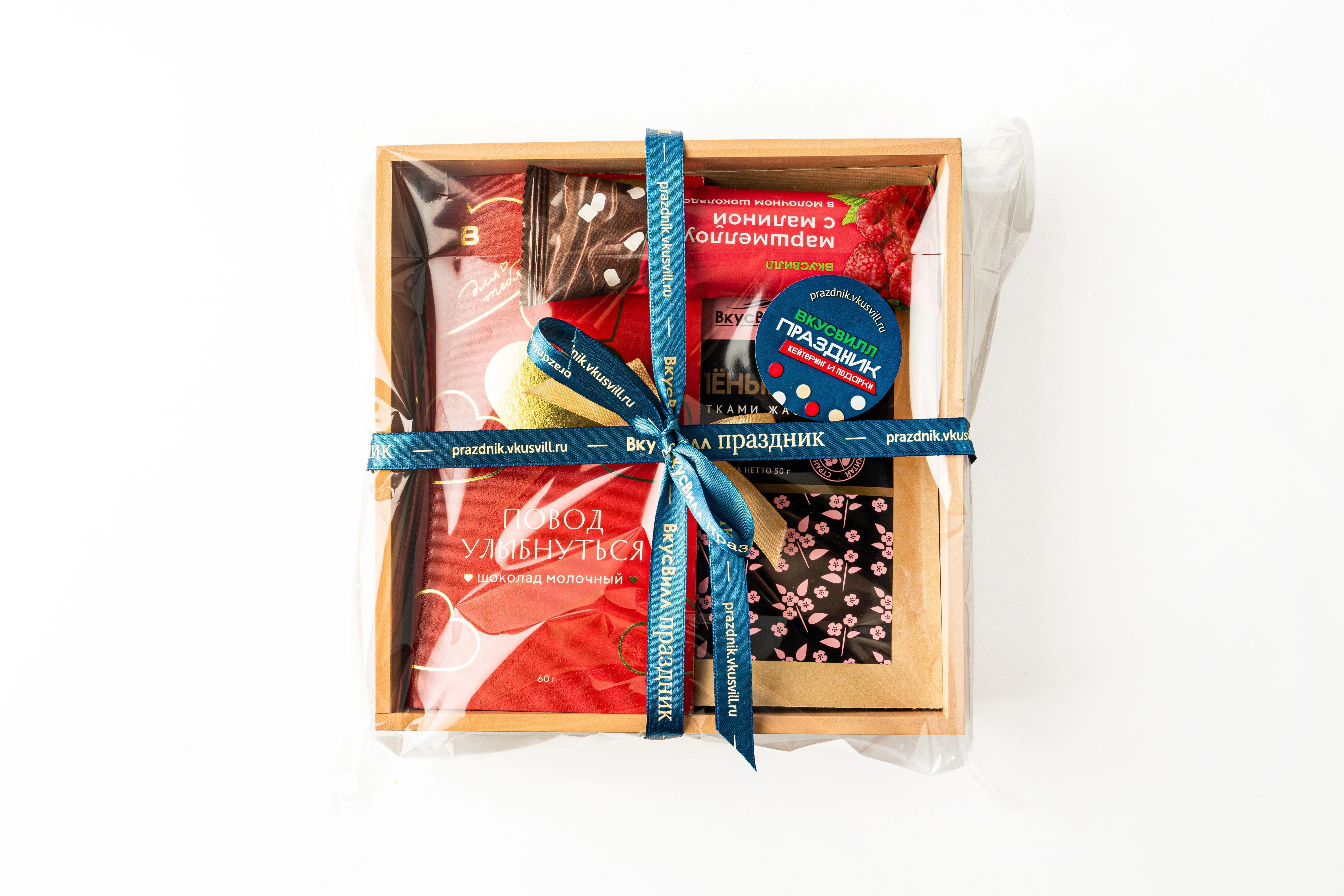 Небольшой, но наполненный теплом и вкусом — этот бокс подойдёт для тех, кто любит уютные чайные паузы. Внутри — два вида рассыпного чая: зелёный с жасмином и чёрный кенийский с насыщенным вкусом. В дополнение к ним мы положили тёмный шоколад с миндалём, вишней и малиной, мягкий маршмеллоу в молочном шоколаде и драже с кусочками манго в глазури. Всё аккуратно упаковано в минималистичную коробку — удобно дарить и приятно получать. Такой набор может стать знаком внимания, дополнением к основному подарку или просто способом порадовать близкого человека.