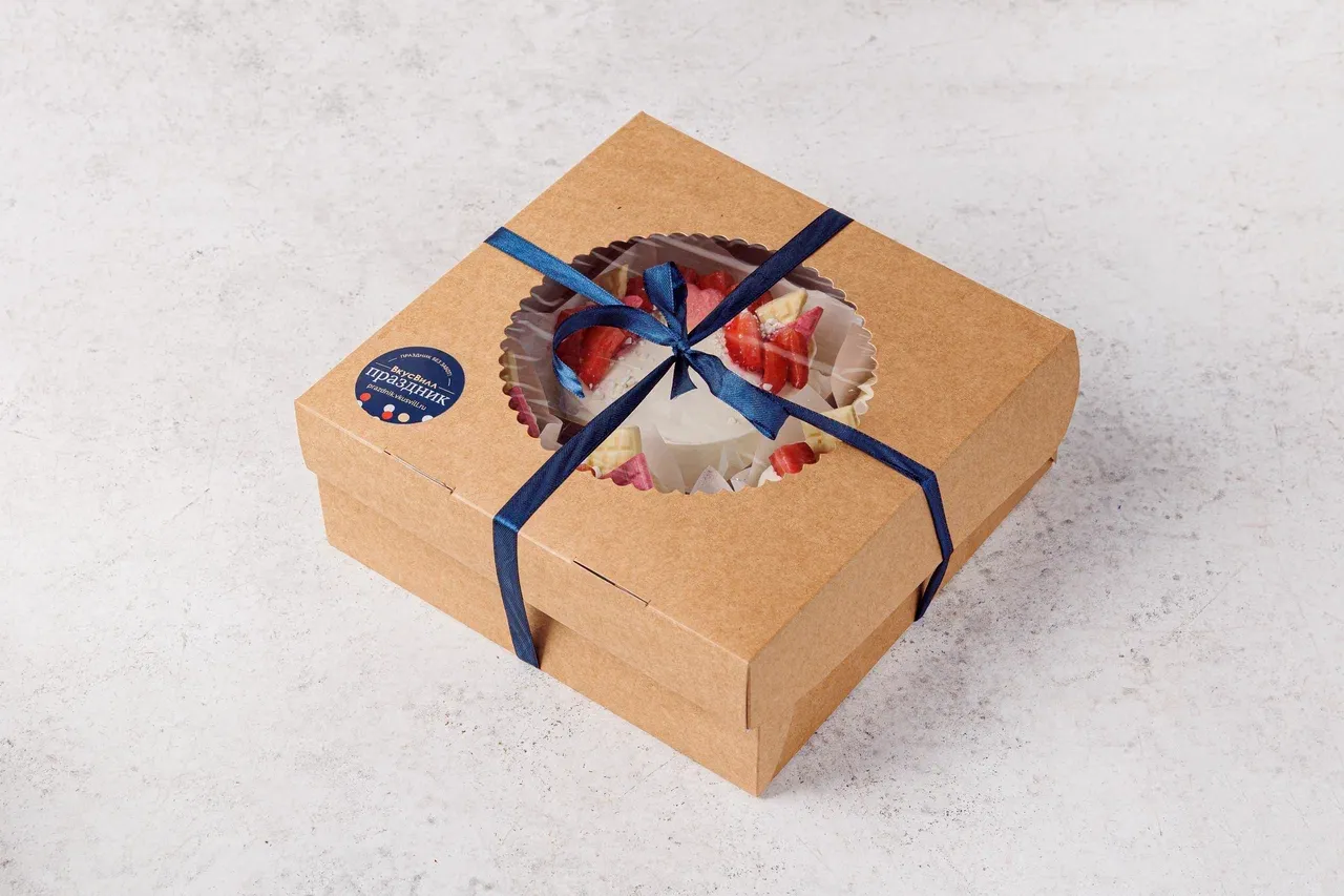 Стандартный размер коробки: 25х25х10 см. Для тортов нестандартной формы — подберем индивидуально.