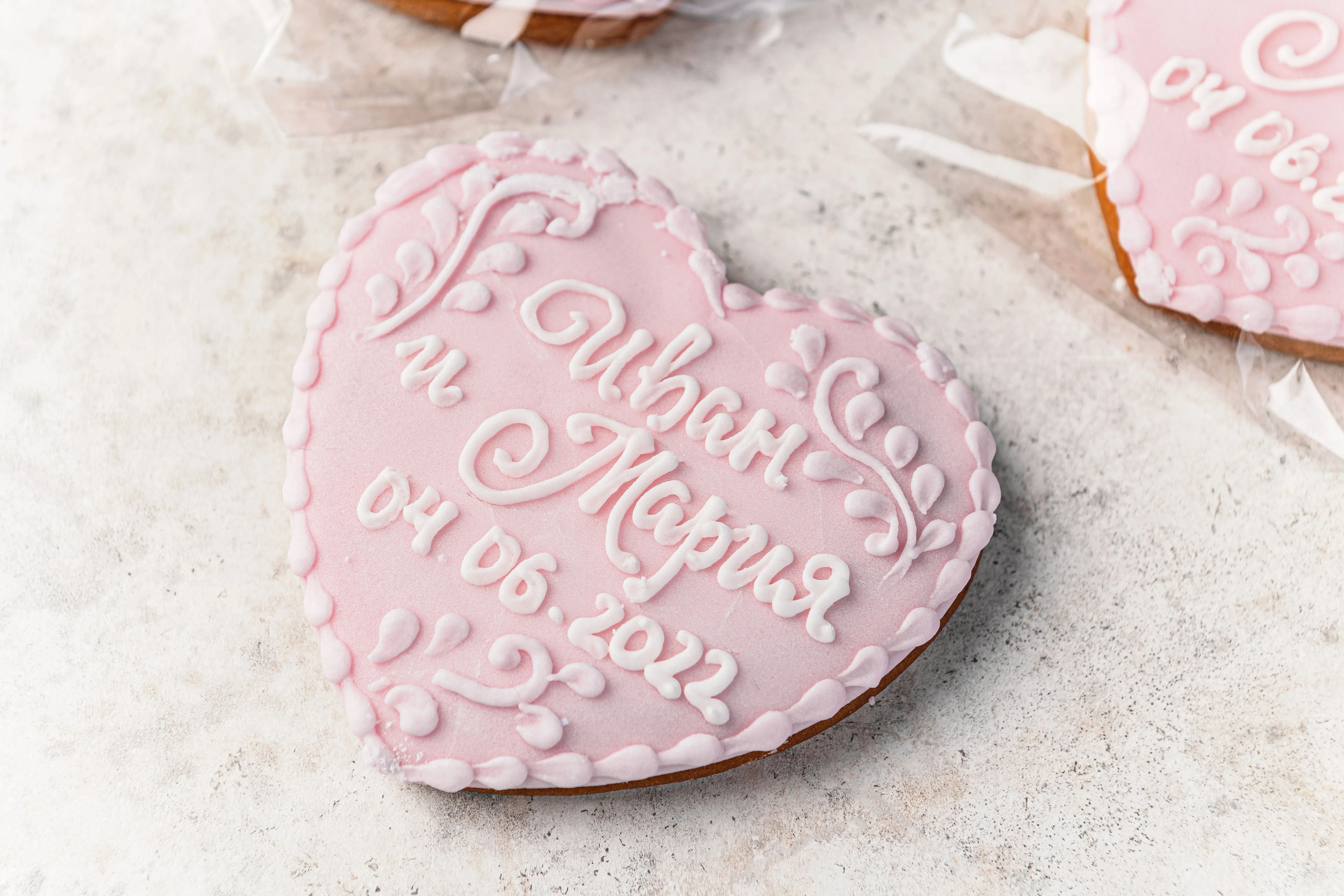 Натуральные имбирные пряники в форме Сердца. Цвет покрытия и текст надписи может быть любой, по пожеланию покупателя.
