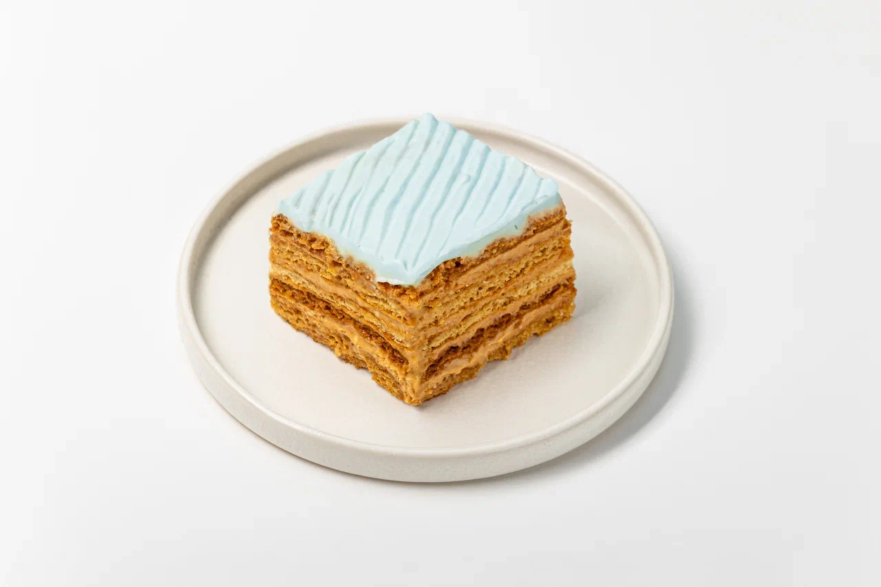 Начинка Миндальная с грильяжным кремом: бисквит: (белок яичный, сахар, миндаль, кукурузный крахмал), крем (сметана м.д.ж.30%(нормализованные, пастеризованные сливки с использованием закваски чистых культур молочнокислых микроорганизмов), сливки м.д.ж.33% (сливки нормализованные), вареная сгущенка (молоко нормализированное, сыворотка молочная, сахар (сахароза), мед натуральный, сахар. Покрытие крем: сливки натуральные м.д.ж. 33% (сливки нормализованные),творожный сыр (нормализованное пастеризованное коровье молоко, бактериальная закваска, молокосвертывающий фермент микробного происхождения), загуститель, стабилизатор (камедь рожкового дерева и гуаровая камедь), регулятор кислотности лимонная кислота, соль поваренная пищевая, вода питьевая)