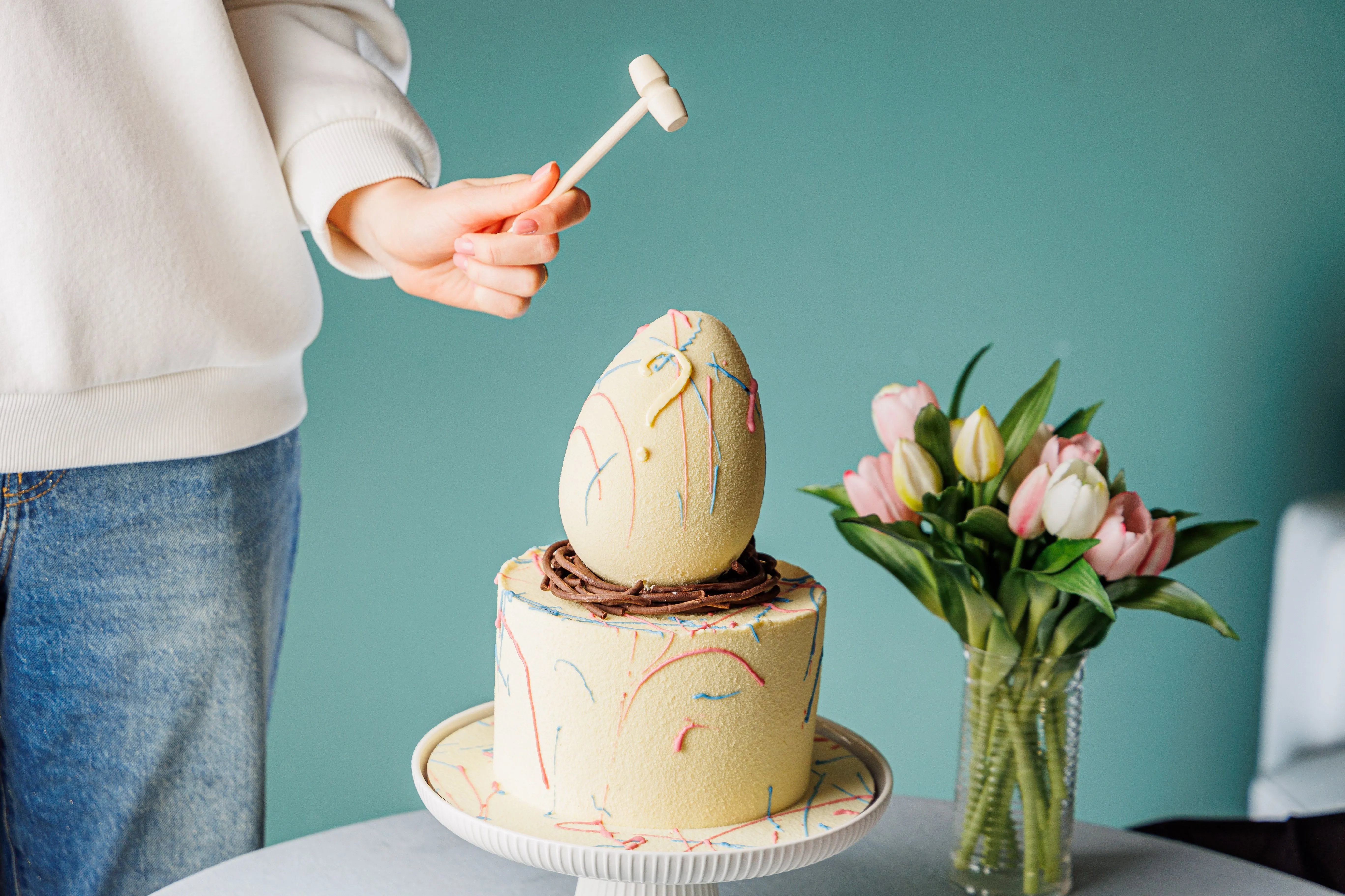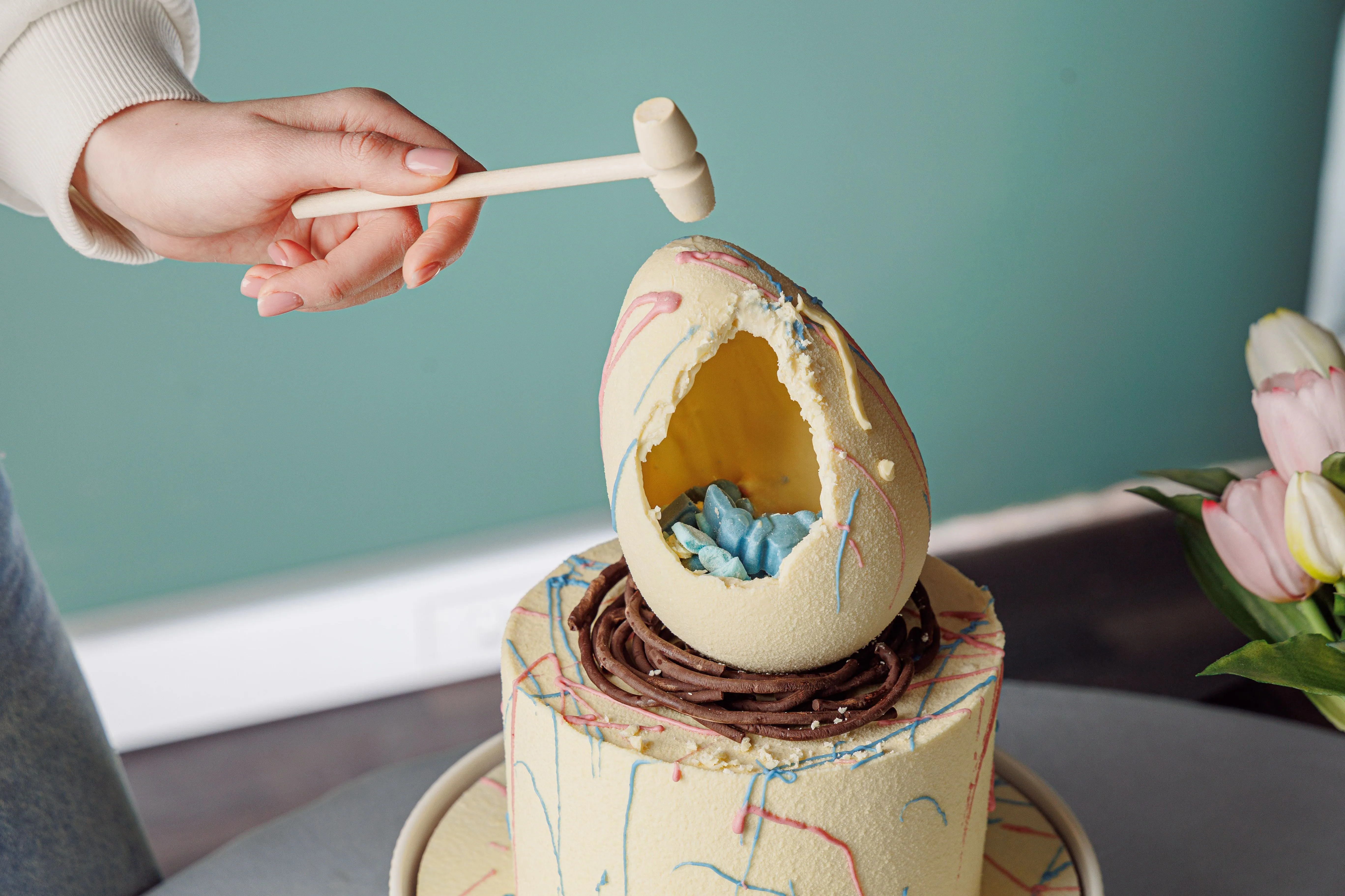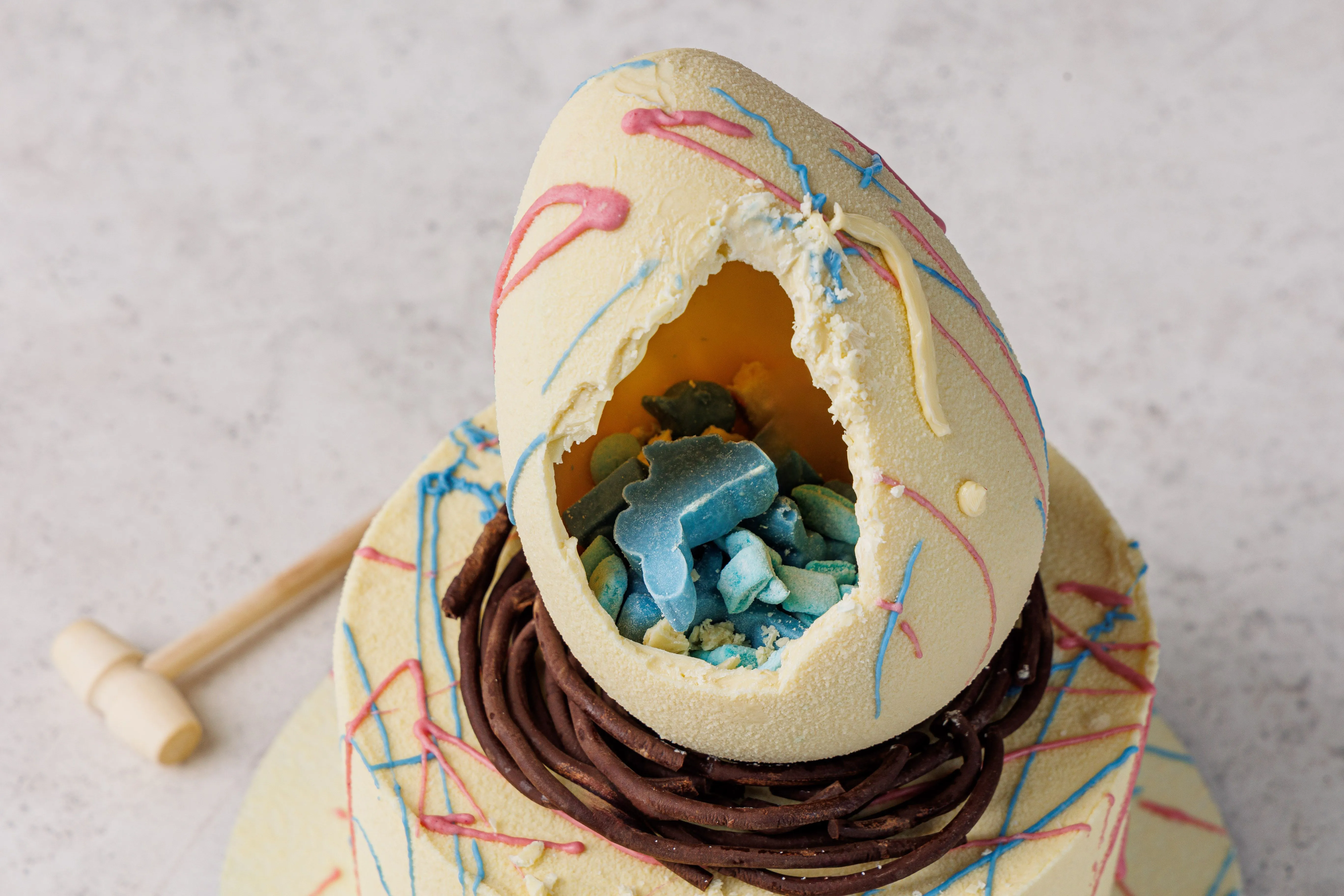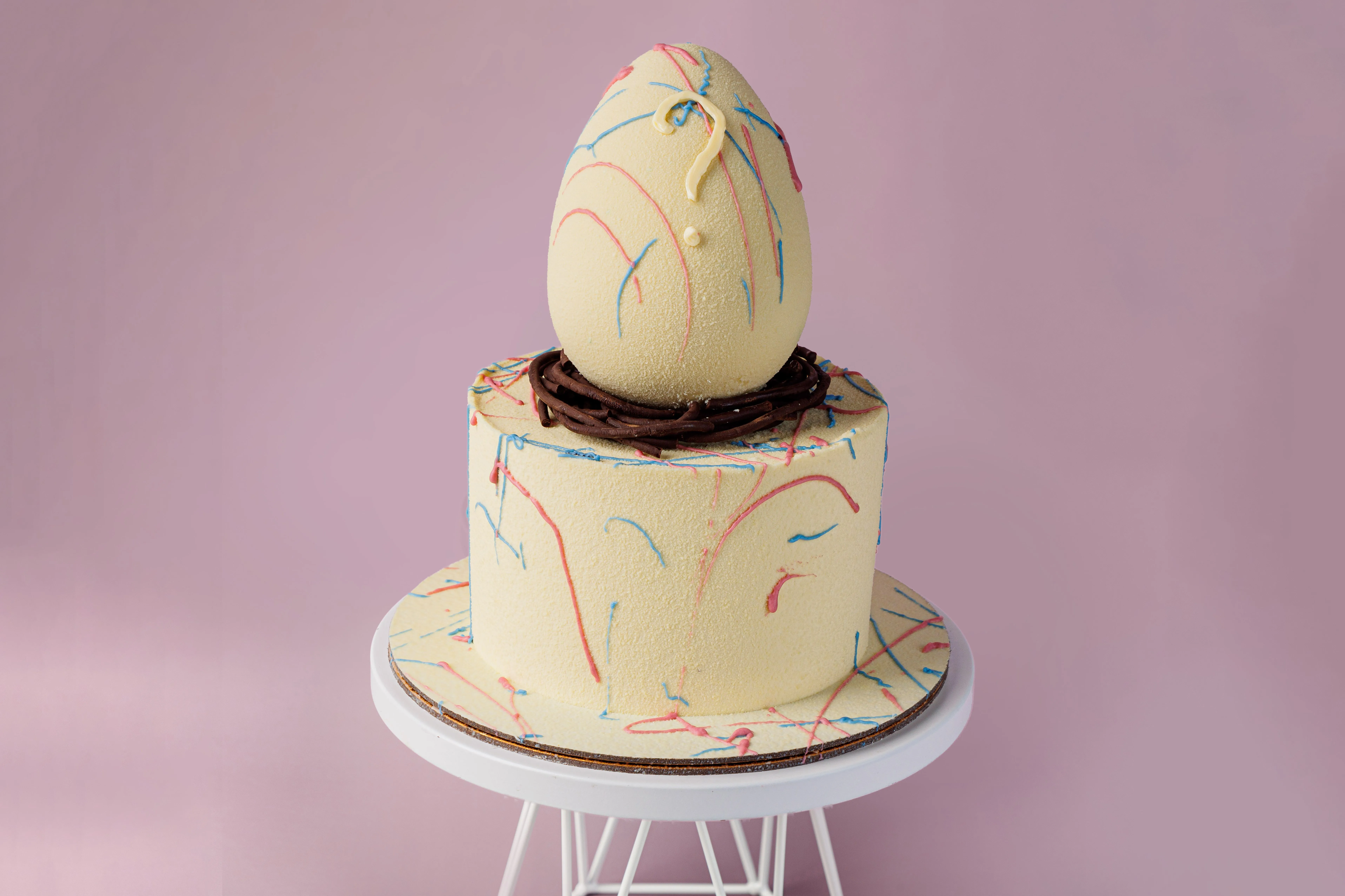 Декор: шоколадные узоры, яицо; шоколадная масса белая (сахар, какао масло, молоко сухое обезжиренное, молоко сухое цельное, эмульгатор: соевый лецитин, ваниль, экстракт спирулины, кармины. Шоколад молочный (какао-масло, тертое какао, сухое цельное молоко, тростниковый сахар, эмульгатор - подсолнечный лецитин, натуральный ароматизатор ваниль. Наполнение: желатин пищевой, яичный белок, сахарная пудра, глюкозный сироп, экстракт спирулины, кармины. пряности: корица молотая; имбирь молотый; гвоздика молотая, краситель: экстракт генипы, сафлоры