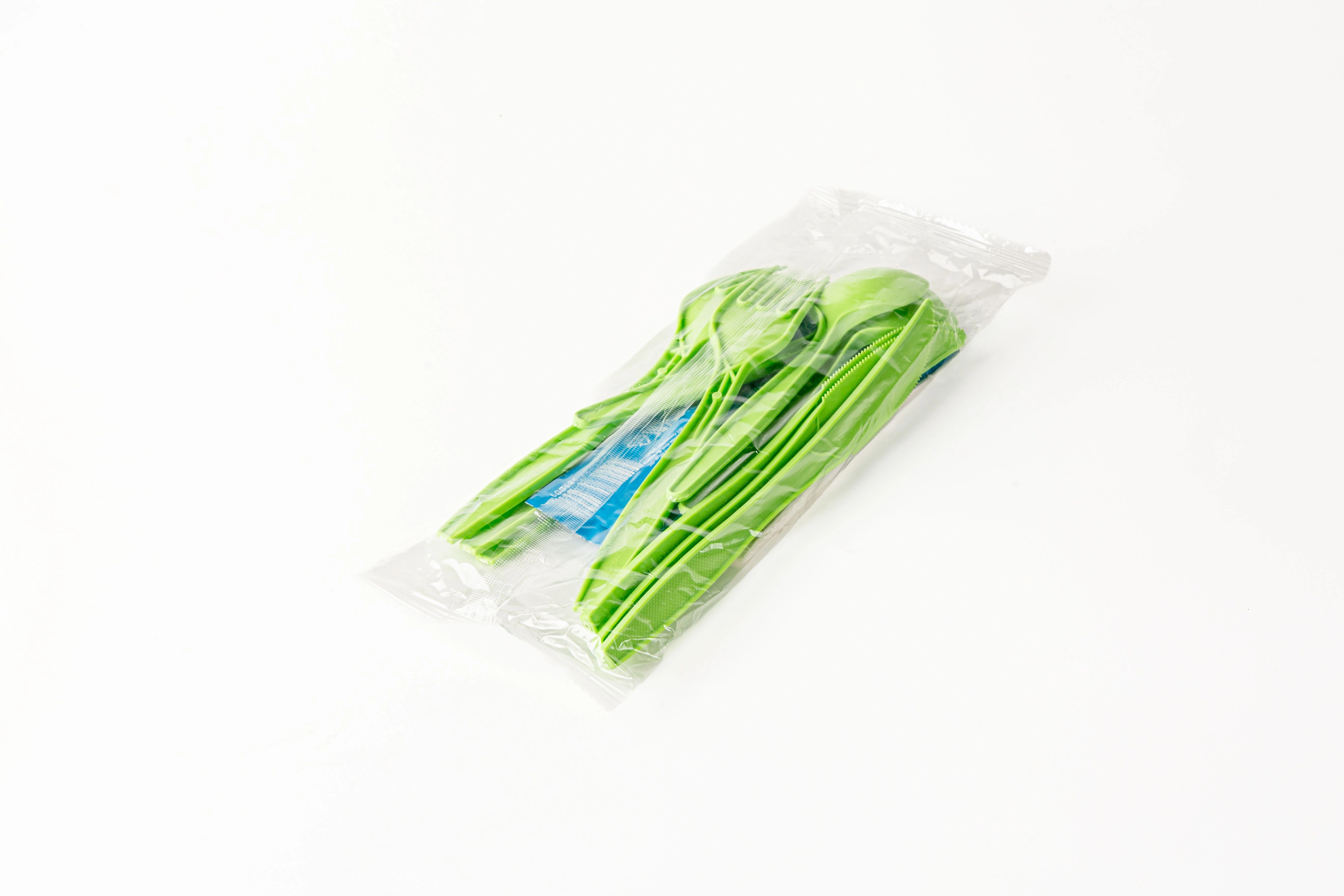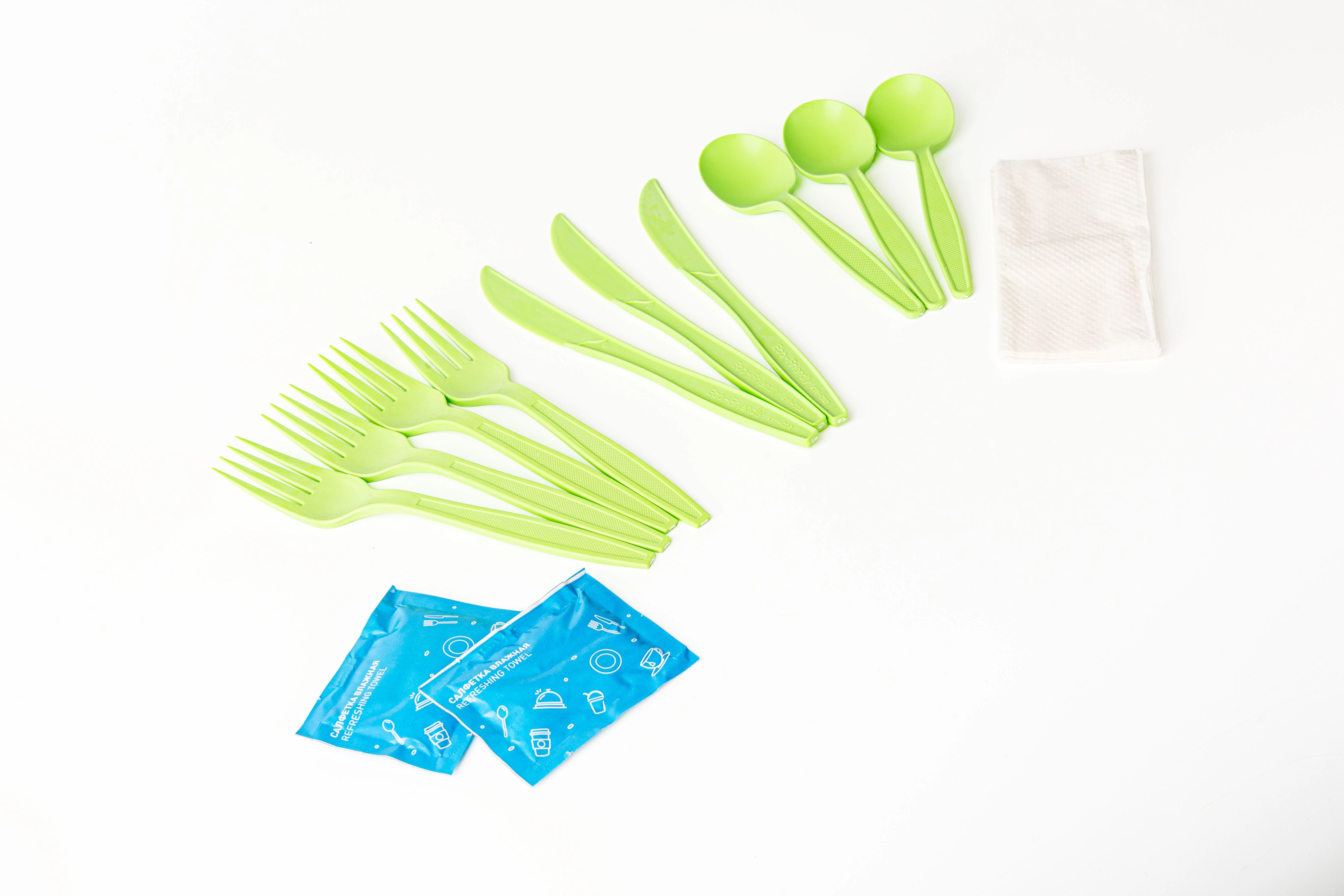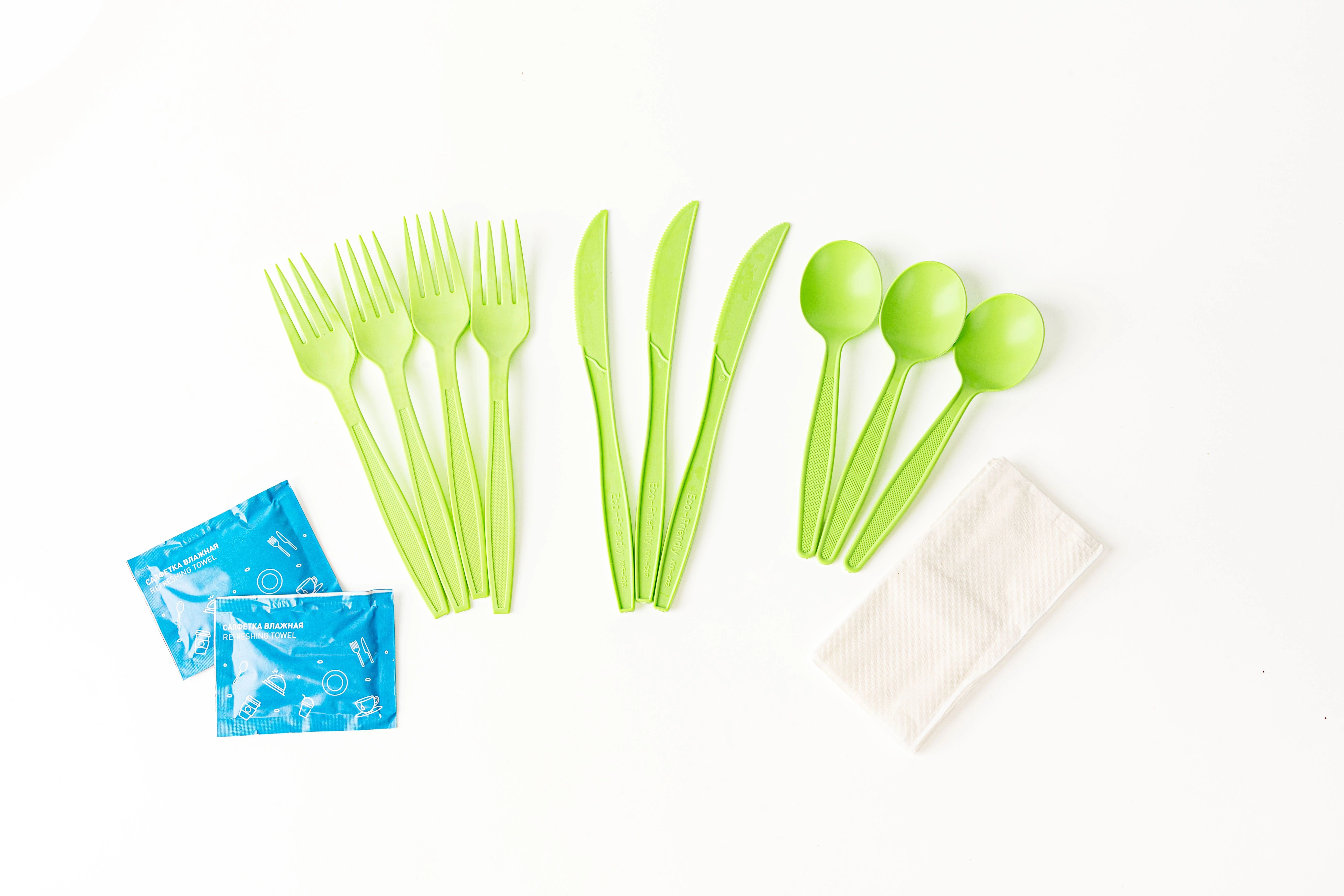 В набор входит: 3 вилки, 3 ножа, 3 ложки, 2 влажные салфетки.