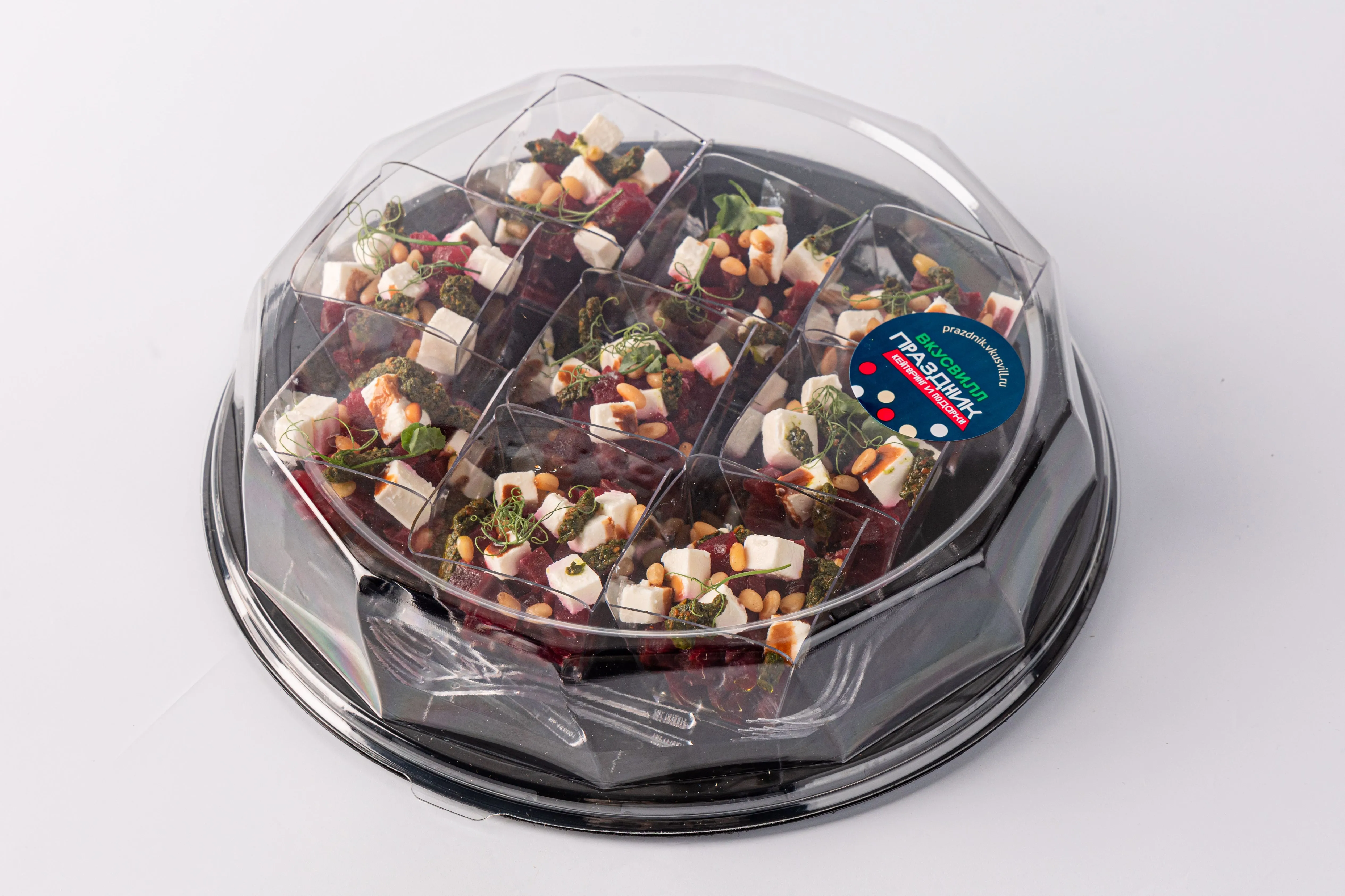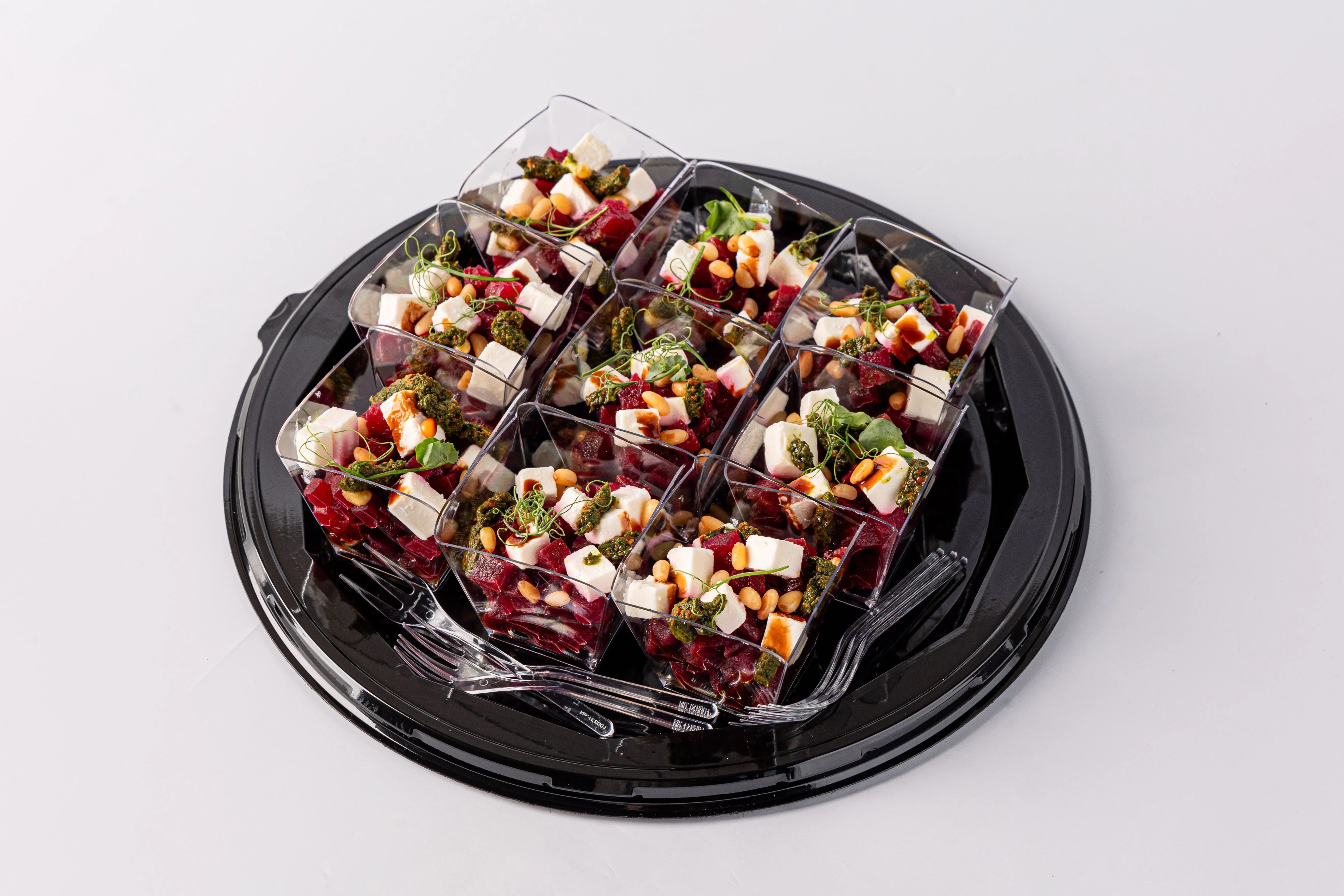 Фуршетный салат «Со свеклой и сыром Фета» в стильных стаканчиках — это яркое сочетание нежной свеклы и солоноватой феты, дополненное лёгкими нотками зелени и заправкой, которая придаёт блюду свежесть. Идеальный выбор для фуршетов и корпоративов, когда хочется предложить гостям что-то лёгкое, но изысканное.