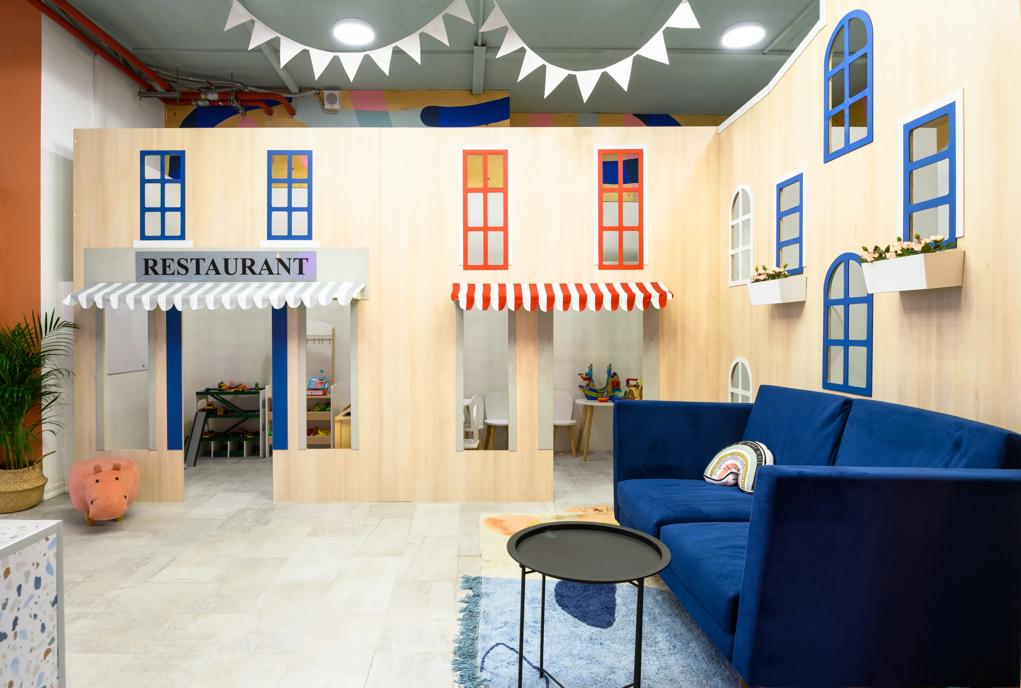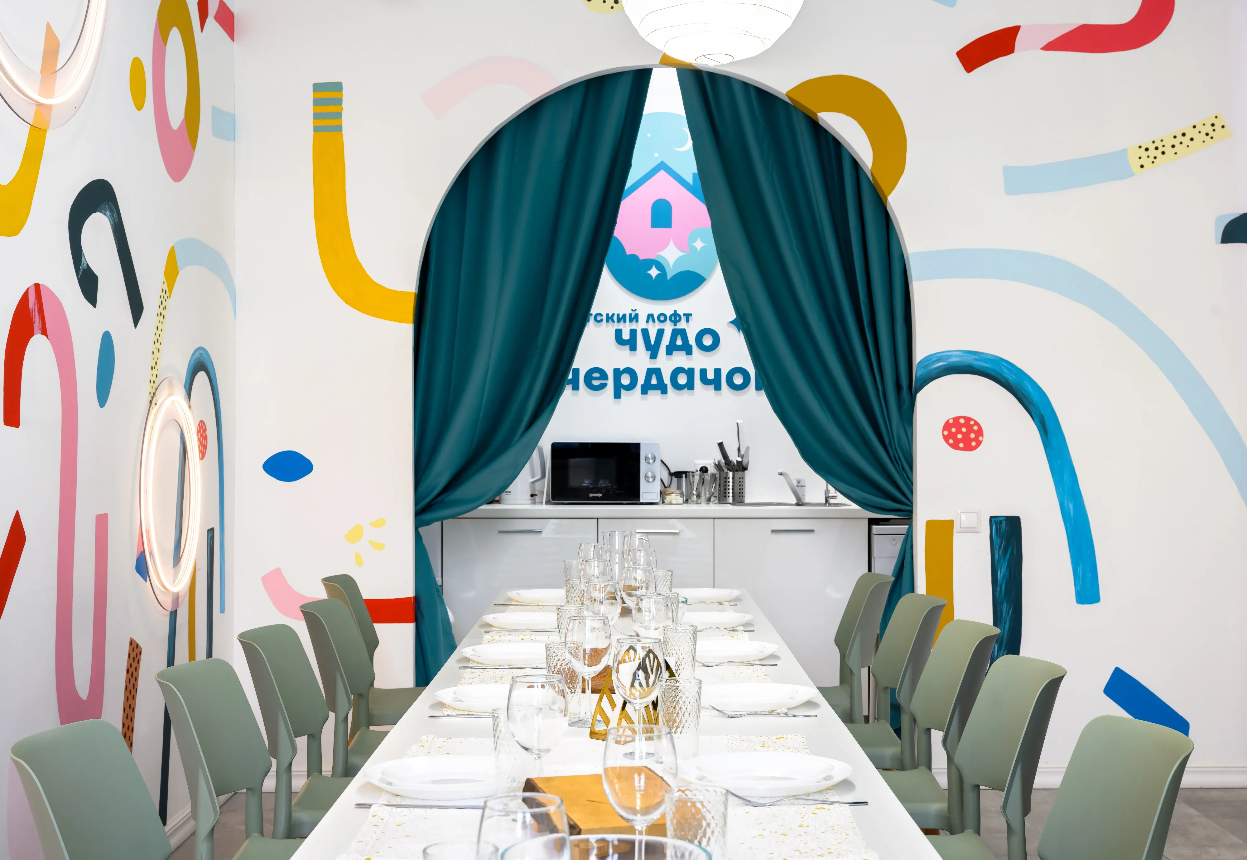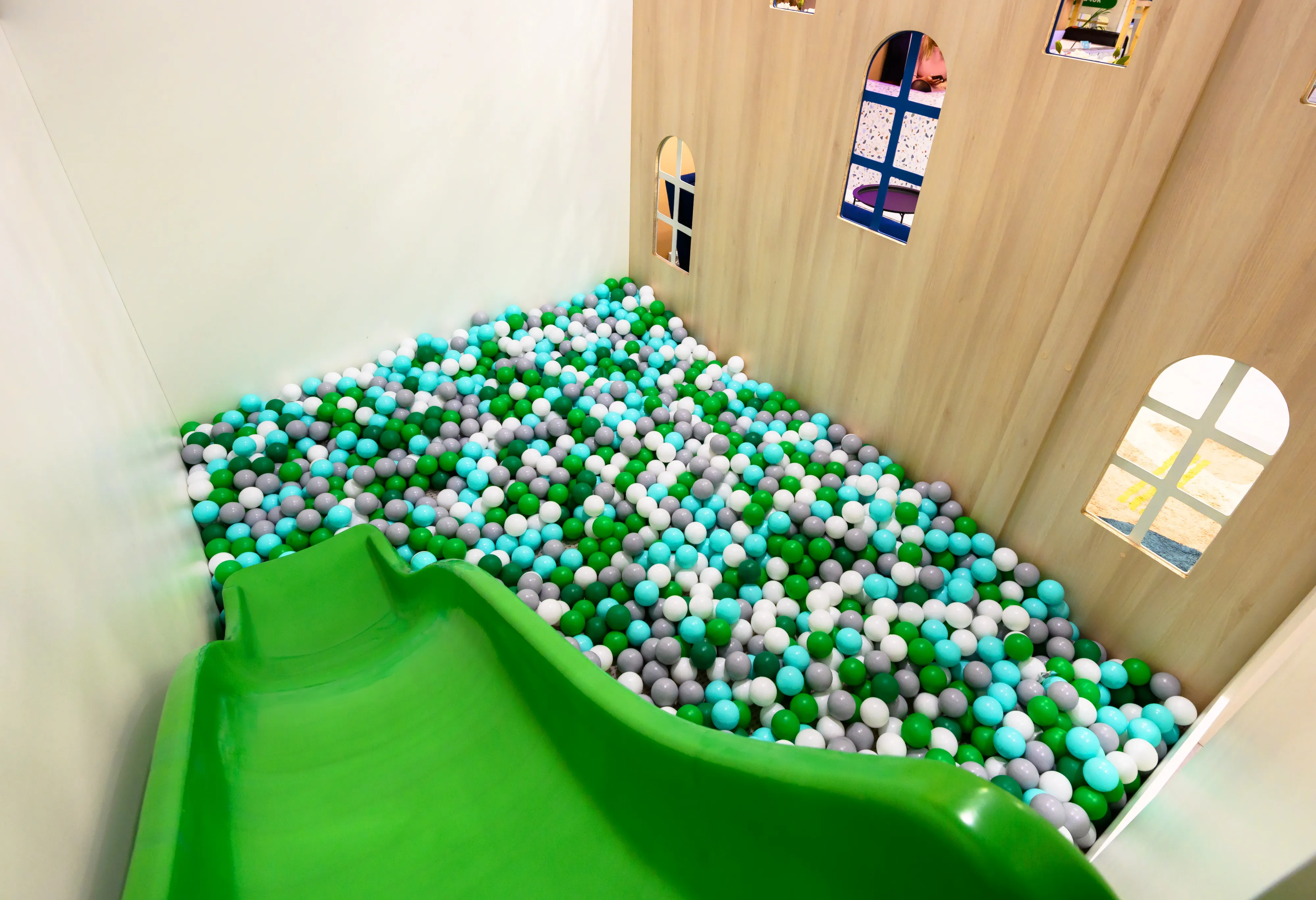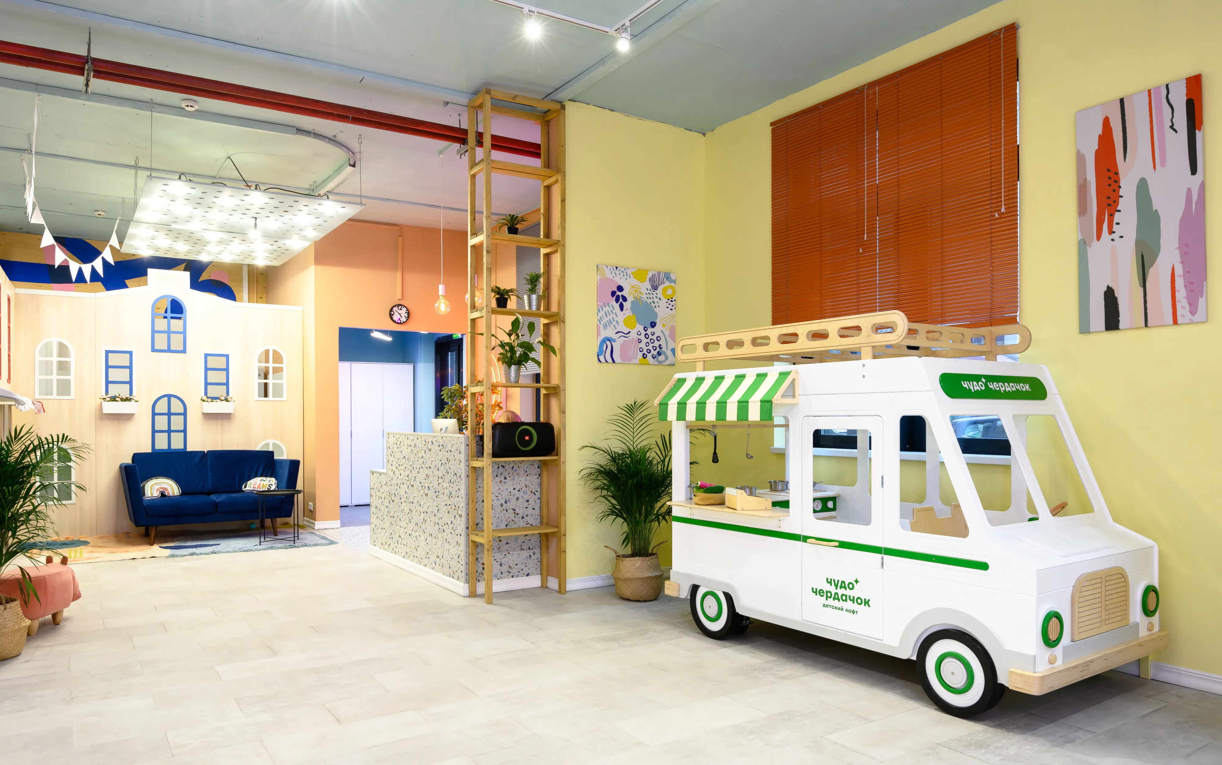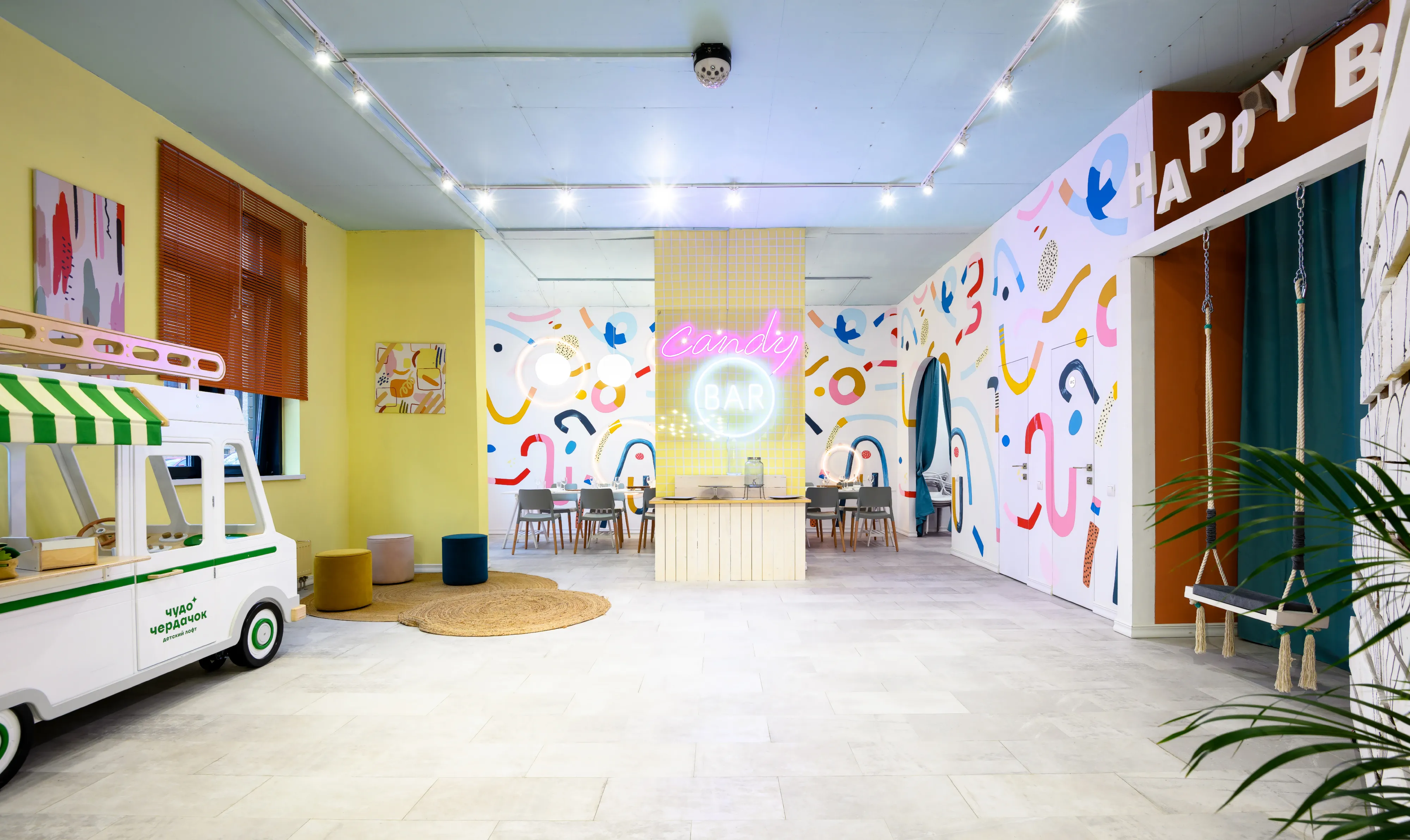 Игровая зона, тематические домики с горкой и бассейном с шариками. Брендированный фуд-трак с тематическими игрушками. Интерьерные качели и стационарная фотозона для создания ярких фото.